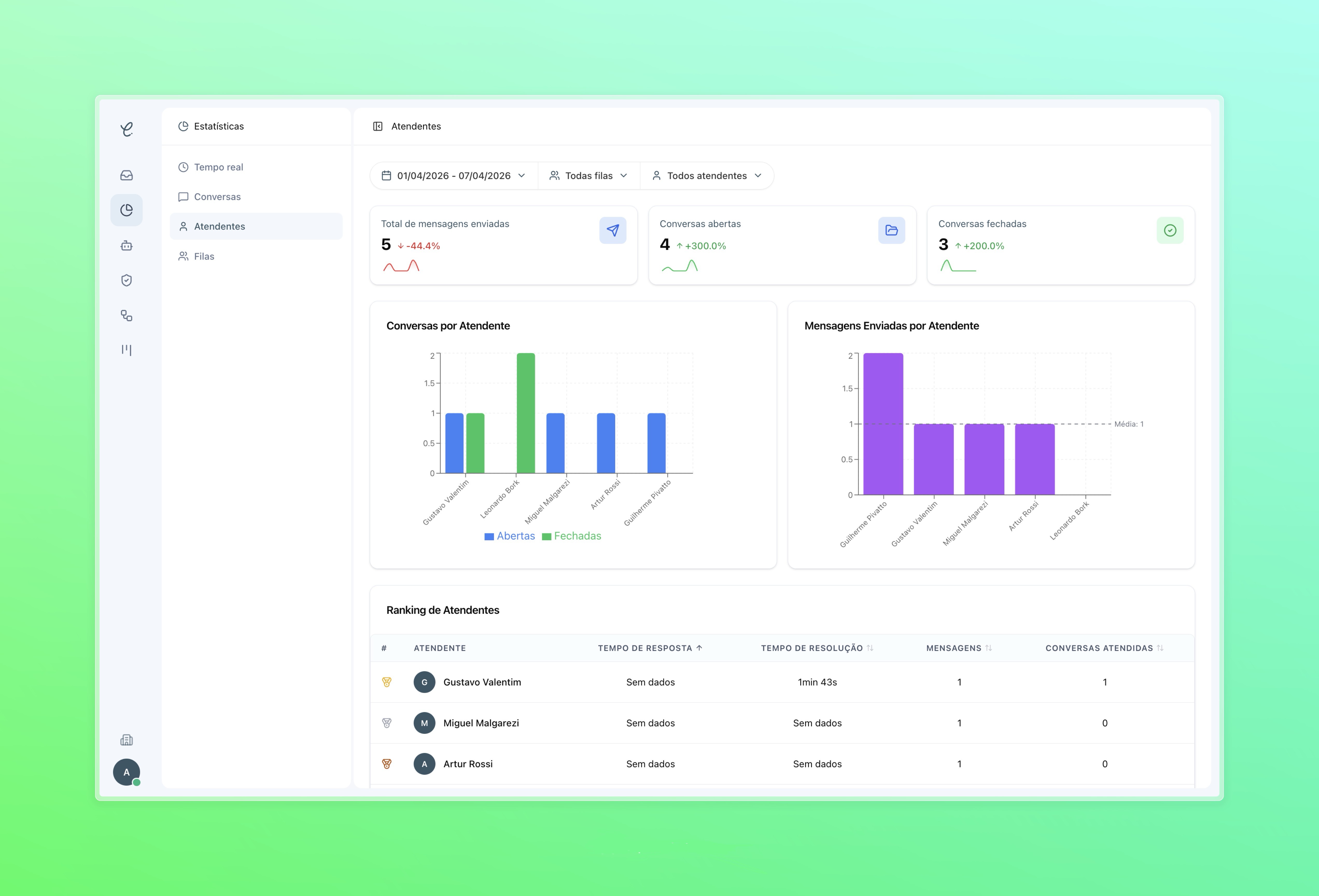 7 DE ABR. DE 2026v2.0.3NovoCorreçãoEstatísticas de conversas, fluxos por inatividade, IA atribui filas, adiciona etiquetas e encerra conversas.EstatísticasFluxosAgentes de IAConfigurações